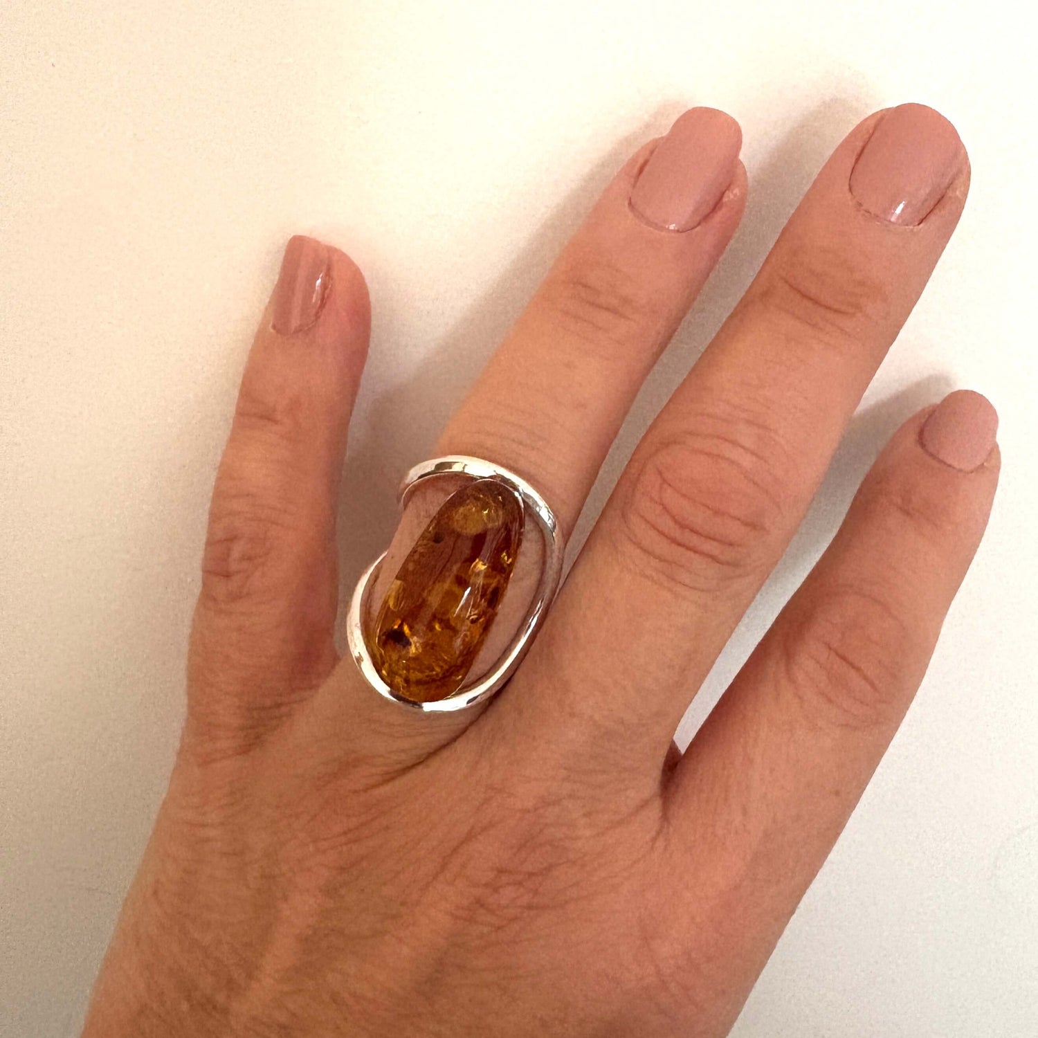 An eye catching ring that captures the natural glow of fossilized amber in a refined sterling silver setting.